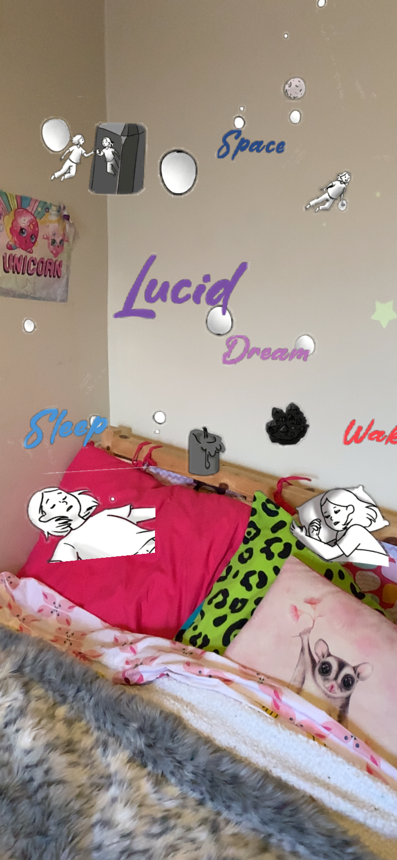 Unintentionally, my white pillows, sheets and blankets on my bed seem to resemble the clouds drifting over the roof, and that is where I think part of me must travel to as I drift asleep. I dream of flying, lifting my feet off the ground and heading towards other planets, leaving Earth – this part is intentional, unlike my cloud bed, as at this point, I am aware that I am dreaming. I control my arms, my legs, my spirit as I choose to leave and explore what else is out there. The scent of my unlit Champagne and Strawberries candle that fills my room fades as I fall asleep. The air blown onto my body from my ceiling fan ceases to exist. The amethyst crystal that sits on my desk beside my bed somewhat resembles the distant purple planets that I hope to land on. I’ve always thought crystals look like they have come from space. As pretty as it is, the crystal has been collecting dust for quite some time; neglected, like I have neglected my surroundings in my mind, leaving my room behind. My dreams are so vivid that after I wake, I wonder if it is only my body that was present in my room. Is my soul separate from my brain? Is the universe in my mind purely an illusion, or could it be that I have really left my mind? Unlike my wooden bed frame, the sharp edges of the crystal and the soft bed sheets, my dream was not tangible…but could it be that it was real?